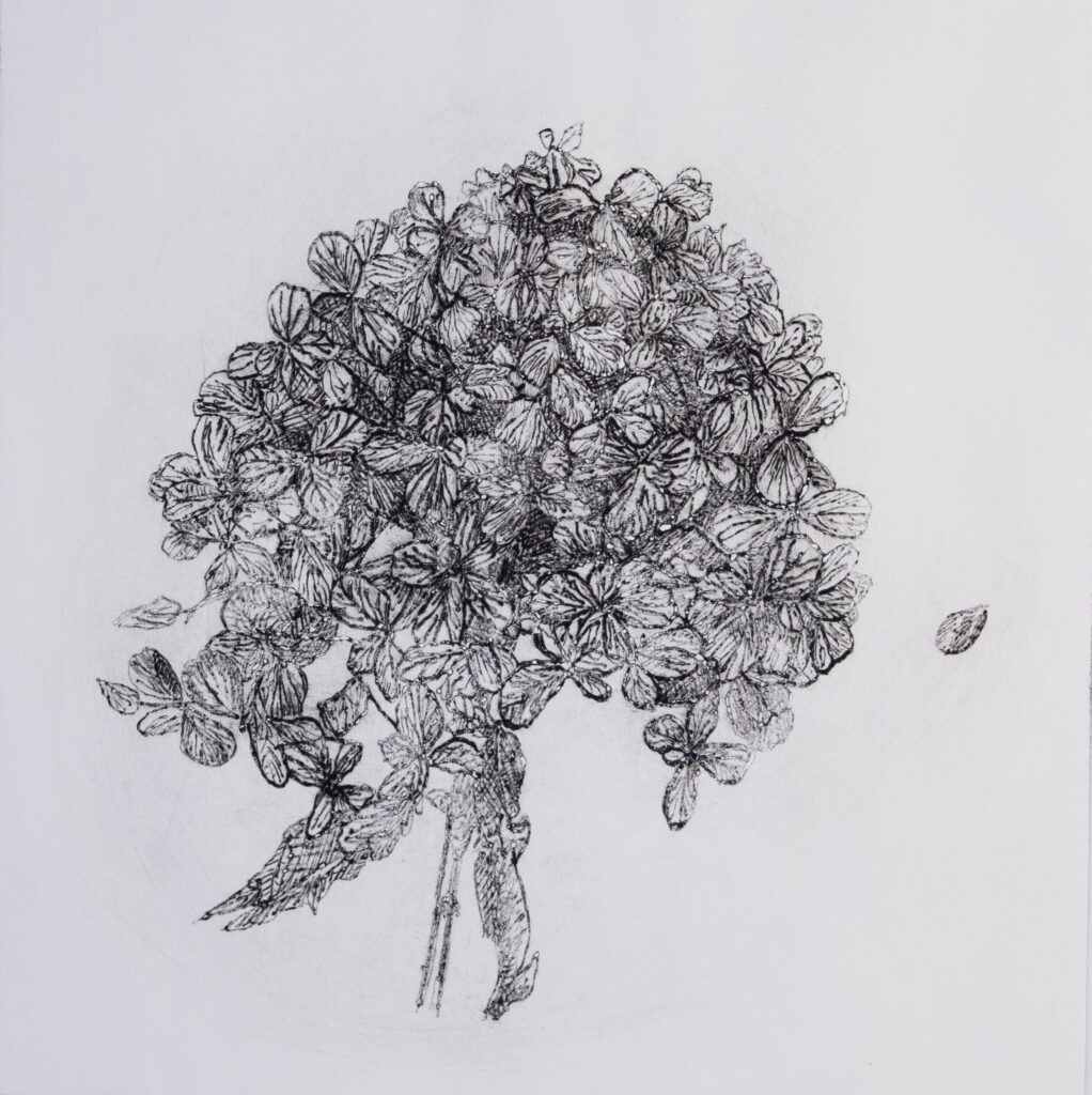 "IX. Hydrangea" is a peaceful printmaking work featuring a dense cluster of hydrangea blossoms rendered in fine black lines against an open white ground. The composition is simple and balanced, allowing the intricate petal shapes and layered textures to carry the image. Each bloom is carefully articulated, creating a sense of fullness without heaviness, as if the flowers are gently suspended in space. What stands out first is the quiet precision of the linework. The absence of background detail gives the piece room to breathe, reinforcing a feeling of stillness and calm. There is no dramatic gesture here—only patience, observation, and care. The overall effect is contemplative and refined, inviting the viewer to slow down and notice subtle variation within repetition. This print fits naturally among floral art prints that prioritize structure and restraint over decoration. "IX. Hydrangea" works beautifully as artwork above a couch, in a bedroom, hallway, or bathroom, where its lightness and clarity add visual calm without overwhelming the space. A timeless print for collectors drawn to botanical imagery and quiet, meditative compositions.