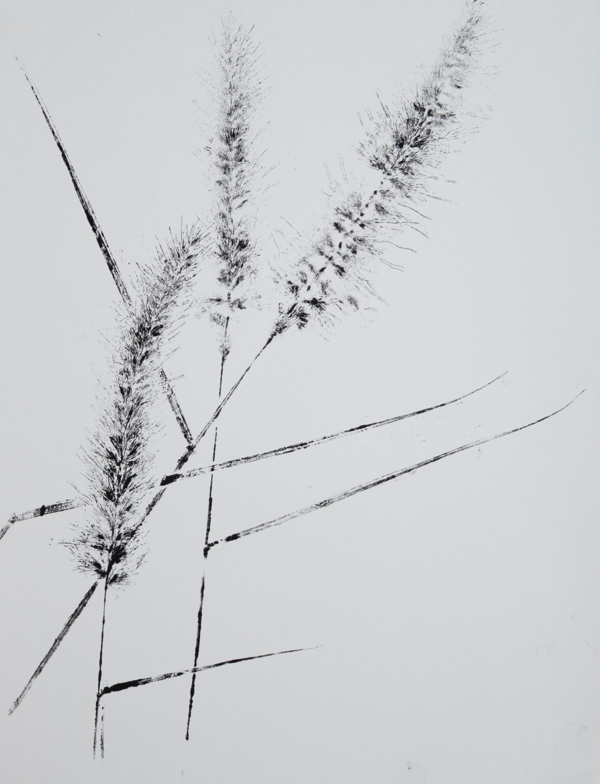 "Wild Grass Monotype I" is a minimalist print featuring tall, wind-swept grass forms rendered in expressive black marks on a pale ground. The composition combines fine, feathery textures with decisive linear strokes, creating a sense of movement without clutter. Ink variations and broken lines reveal the physicality of the monotype process, giving the piece a raw, organic presence. The first thing you notice is the contrast—delicate grass heads balanced against strong, directional lines. The image feels botanical but not decorative, capturing the structure and rhythm of wild grass rather than a literal depiction. The overall effect is simple, graphic, and quietly powerful. A stylish floral art print that leans toward minimalism and modern design, "Wild Grass Monotype I" works well over a sofa or in a living room, kitchen, or bedroom, where its clean composition and vertical energy can anchor a space. A striking print for collectors drawn to natural forms with a contemporary edge.